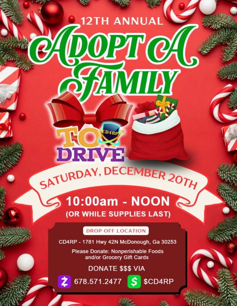 CD4RP is excited to announce our 12th Annual Adopt a Family Toy Drive being held on December 20th 10am-12 noon. Donation drop off is located at 1781 Hwy 42N McDonough GA 30253.