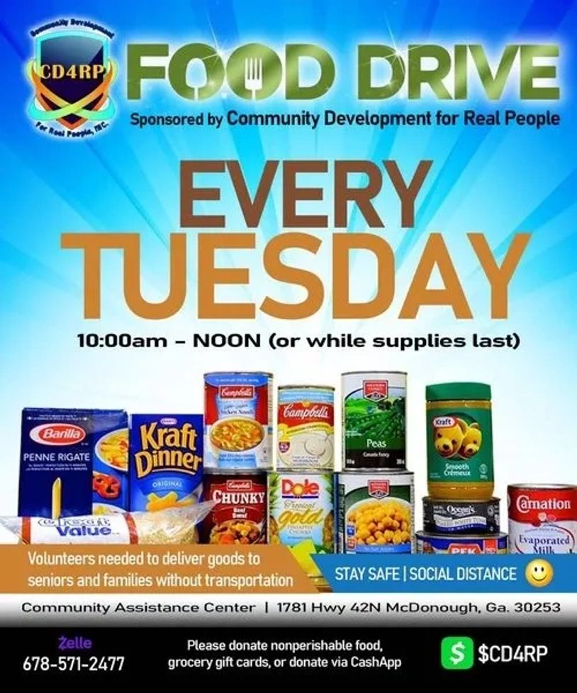 Community Development For Real People (CD4RP) Food Giveaway is held at 1781 GA Hwy 42N McDonough, GA 30253. We are located near Jodeco Rd on Hwy 42N next to O'Reilly Auto Parts.